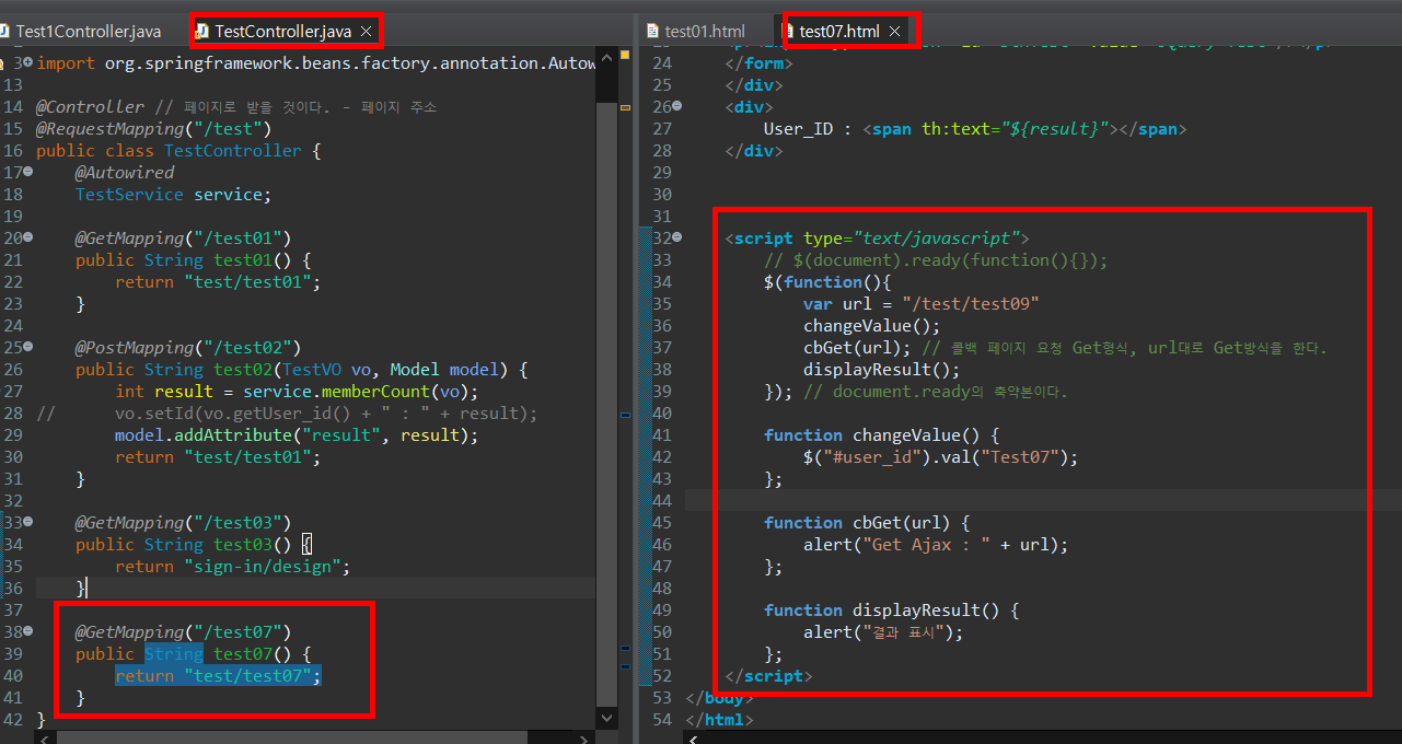 ◾ Test1Controller.java에 있는 test07 은 주석처리하고, TestController.java에 test07을 추가한다.