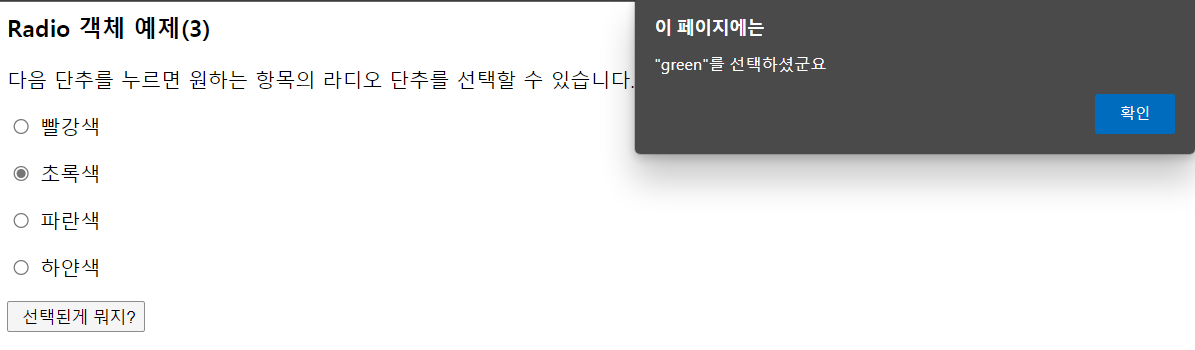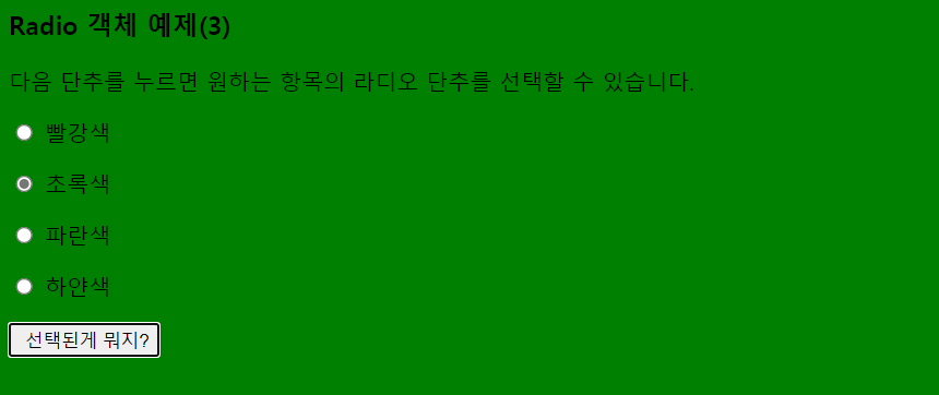<input type= "radio" value = "green" name = "color"> 초록색<br>
